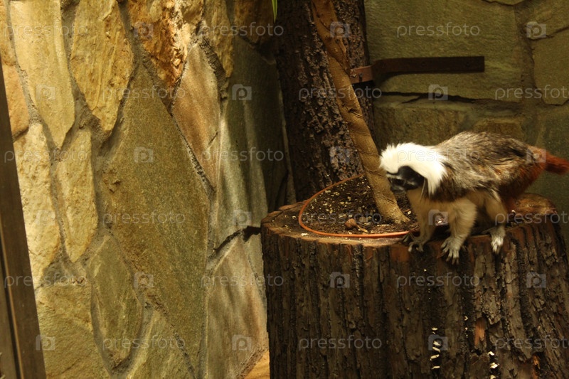 Обезьяна-тамарин смешно стоит на задних лапах на полу в зоопарке