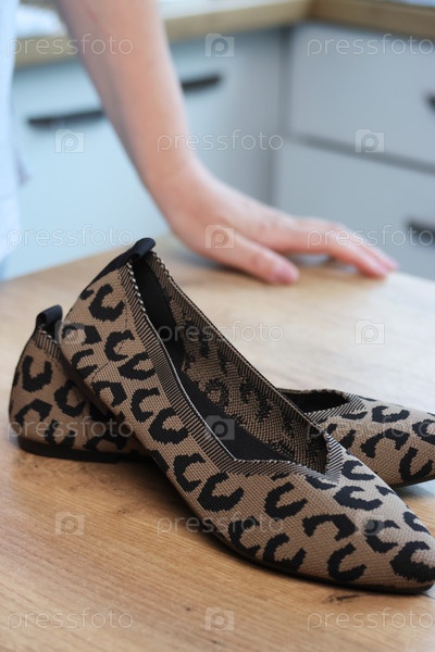 Женщина распаковывает и просматривает ботинки для лодок с печатью леопарда