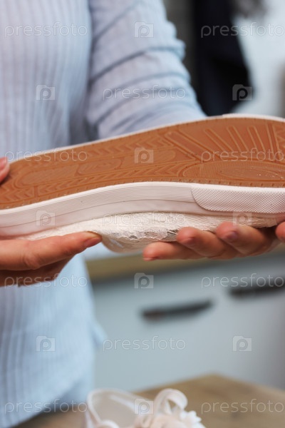 Женщина распаковывает и просматривает белые кроссовки с кружевными топами