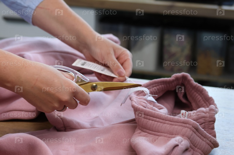Женщина в розовых брюках отрезает этикетку