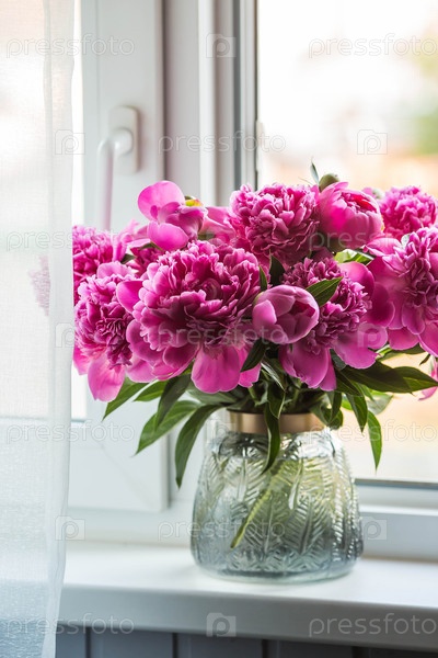 Букет ярко-розовых пионных цветов в стеклянной вазе на подоконнике.Цветы и почки в вазе.Ясный розовый, цветочный фон
