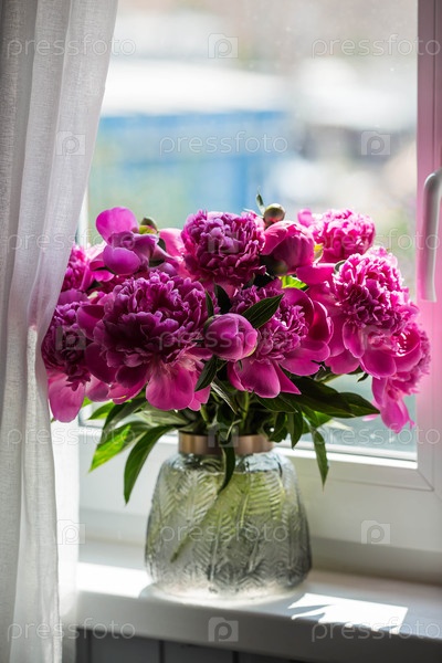 Букет ярко-розовых пионных цветов в стеклянной вазе на подоконнике.Цветы и почки в вазе.Ясный розовый, цветочный фон