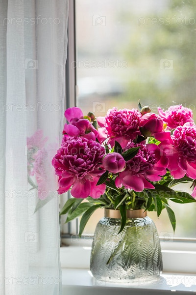 Букет ярко-розовых пионных цветов в стеклянной вазе на подоконнике.Цветы и почки в вазе.Ясный розовый, цветочный фон