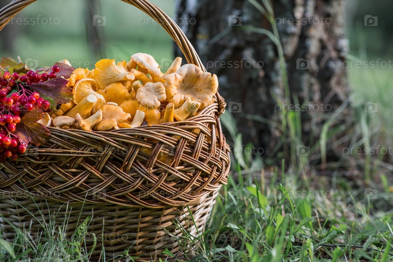 Красивая корзина грибов.Желтые люстры в красивой коробке из уксуса в березовом лесу.Здоровые съедобные Chanterelle mushrooms
