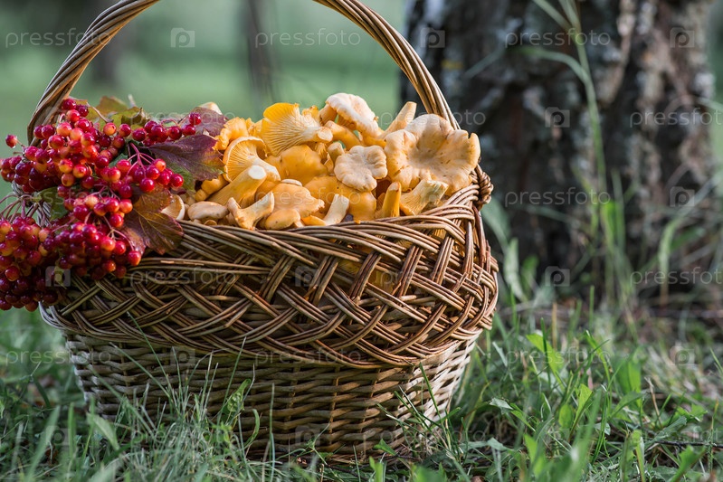 Желтые люстры в красивой корзине из уксуса в березовом лесу. Благородные съедобные грибы Chanterelle. Красивая корзина с грибами