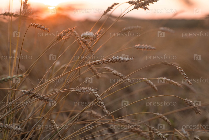 Сельский пейзаж при закате солнца. Золотая пшеница промывается на фоне созревающего поля. Близкий план сельскохозяйственного зернового завода. Концепция посадки и сбора урожая обильных культур