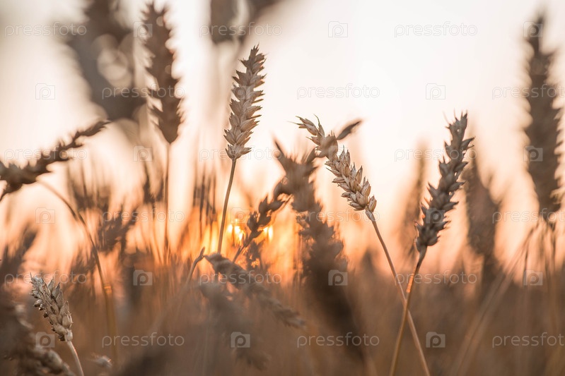 Сельский пейзаж при закате солнца. Золотая пшеница промывается на фоне созревающего поля. Близкий план сельскохозяйственного зернового завода. Концепция посадки и сбора урожая обильных культур