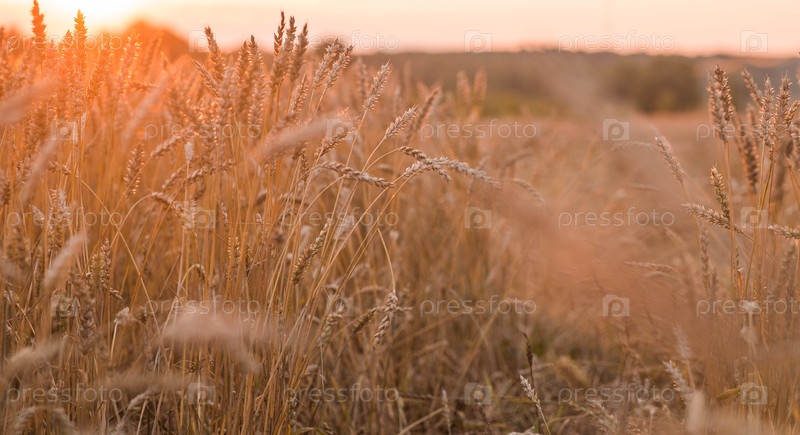 Сельский пейзаж при закате солнца. Золотая пшеница промывается на фоне созревающего поля. Близкий план сельскохозяйственного зернового завода. Концепция посадки и сбора урожая обильных культур