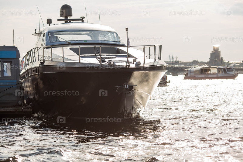 Большая черная яхта, пришвартованная на пирсе на поверхности воды Невы.Россия, Санкт-Петербург, 15 августа 2015