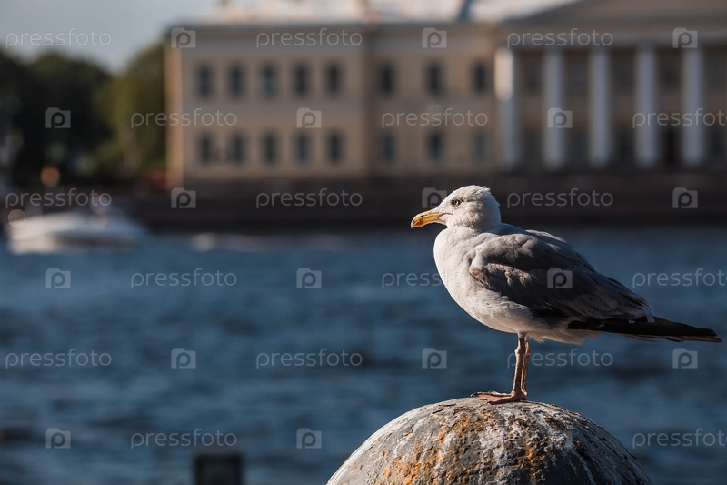 Морская чайка, сидящая на каменном столбе у воды реки Невы