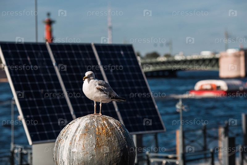 Морская чайка, сидящая на каменном столбе у воды реки Невы