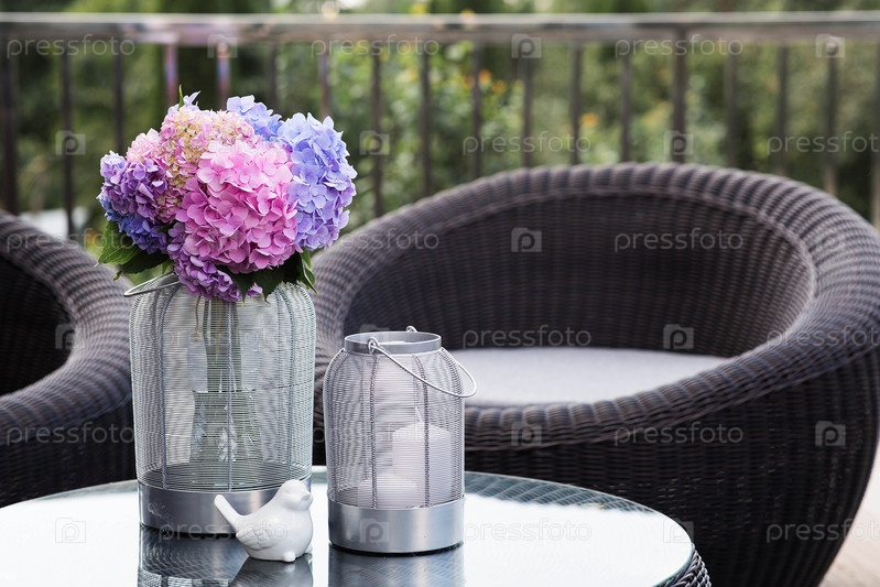 Многоцветные гортензии в интерьере уютной террасы или patio Букет садовых растений Концепция ландшафтного дизайна для дома
