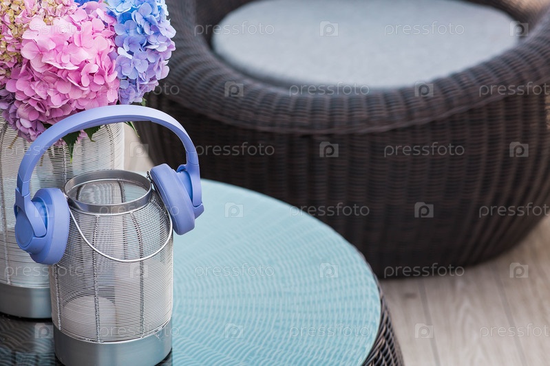 Многоцветные гортензии и беспроводные наушники в интерьере уютной террасы или patio. букет садовых растений на стеклянном столе