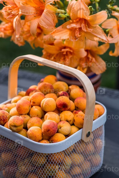 Корзина, полная абрикосов на столе в саду рядом с вазой оранжевых лилий или лайли