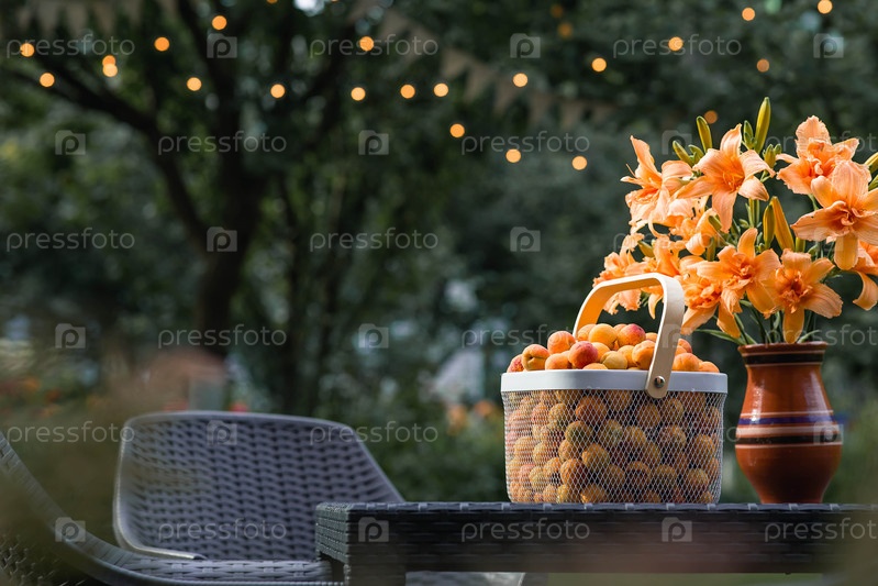 Корзина, полная абрикосов на столе в саду рядом с вазой оранжевых лилий