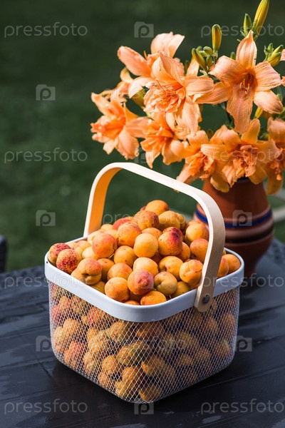Корзина, полная абрикосов на столе в саду рядом с вазой оранжевых лилий