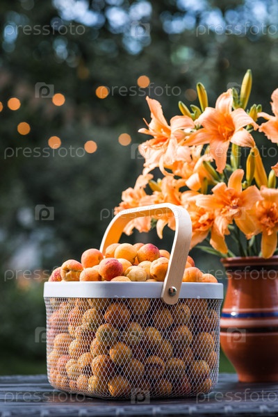 Корзина, полная абрикосов на столе в саду рядом с вазой оранжевых лилий