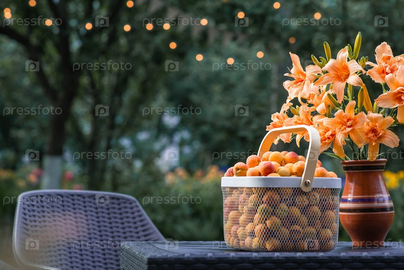Корзина, полная абрикосов на столе в саду рядом с вазой оранжевых лилий