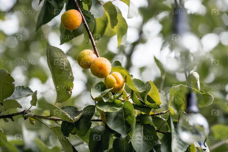 Древесные ветви с желтыми и оранжевыми абрикосовыми плодами среди зеленых листьев