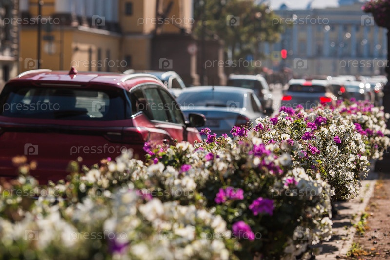 Ряд цветущих растений вдоль городской улицы с автомобилями в большой пробке на городской улице