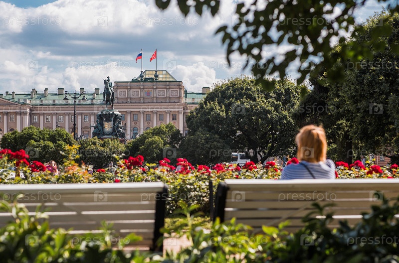 Памятник Николаю I и здание Законодательного собрания на площади Святого Исаака.Россия, Санкт-Петербург, 15 августа 2025 года