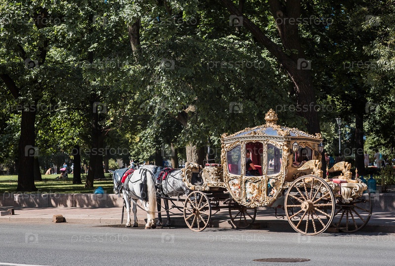 Золотая королевская колесница с белыми конями в городском парке возле собора святого Исаака в Санкт-Петербурге