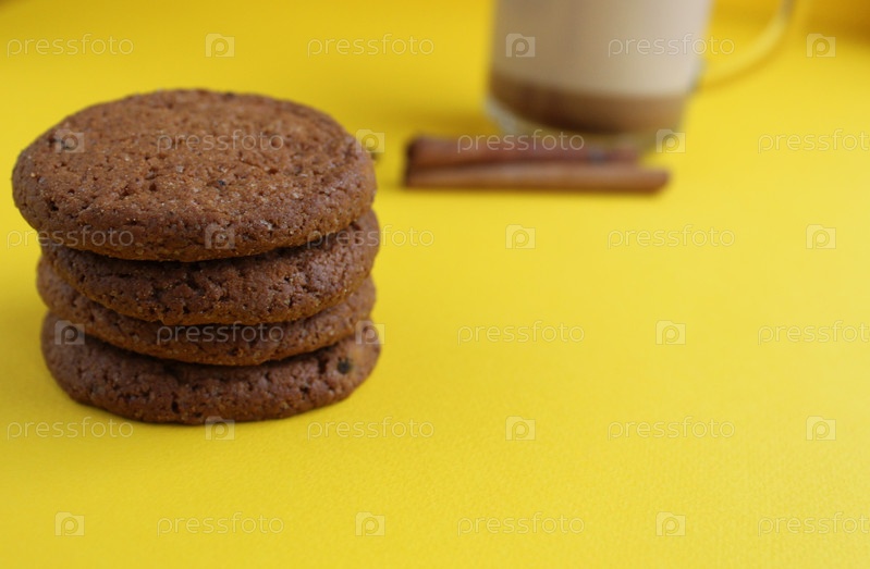 Печенье из домашней овсяной муки лежит на куче слайдов на ярком желтом фоне с пространством для текста и копирования