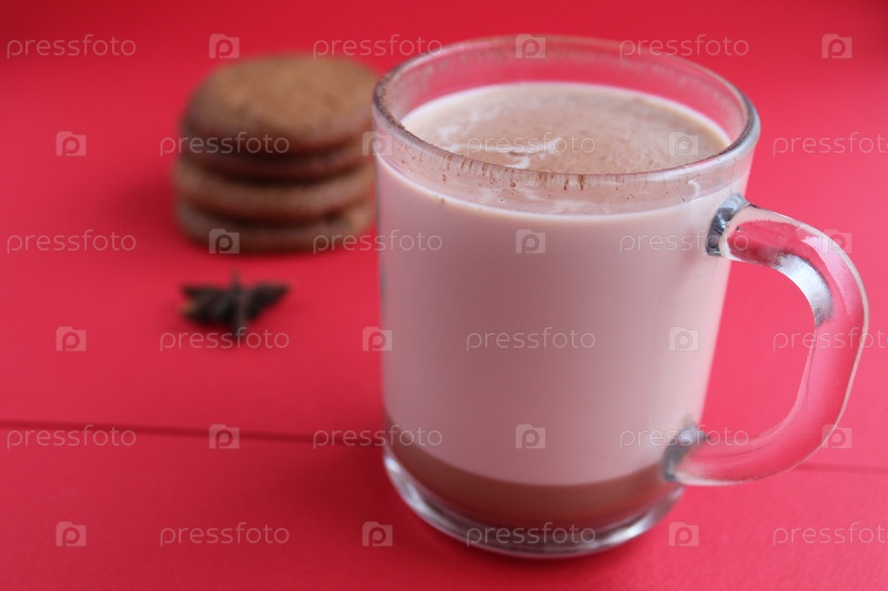 Горячий шоколад из какао в стеклянной кружке на красном фоне с комнатой для копирования текста и печеньем по адскому плану
