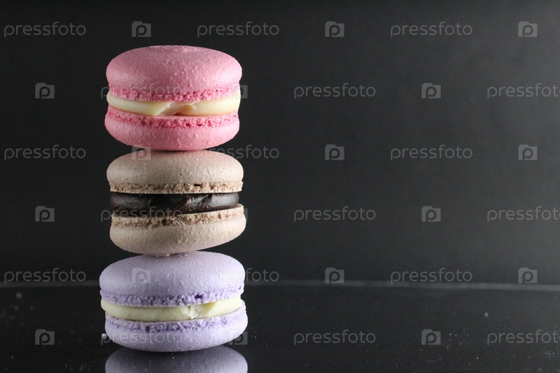 Три коричнево-розовых торта с макаронными изделиями на черном блестящем фоне, где есть место для текста и копирования
