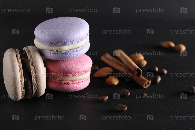 Макаронные и коричневые миндальные палочки лежат рядом с черным фоном с пространством для текста и копирования