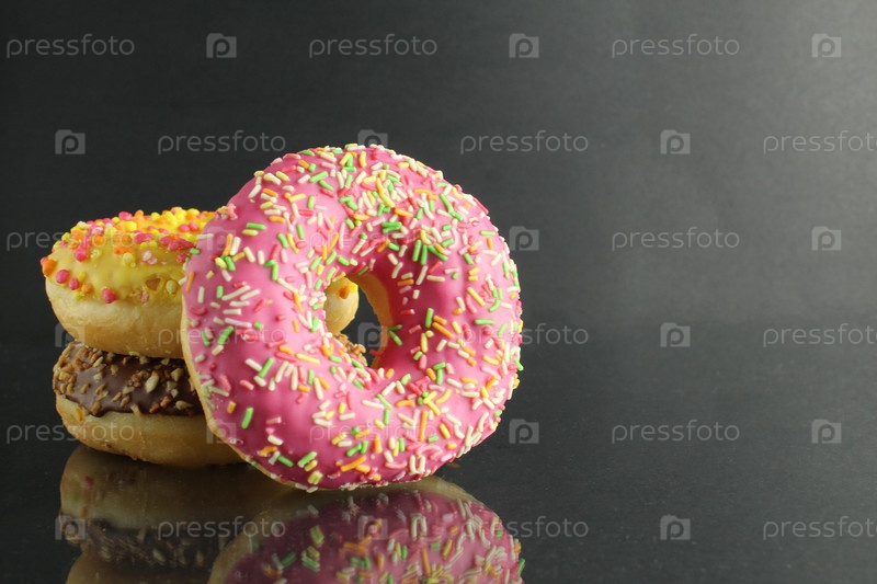 Берлинские пончики с розово-желтым мороженым лежат в ногах и розово-яркие подъемники на черном фоне со свободным местом для текста