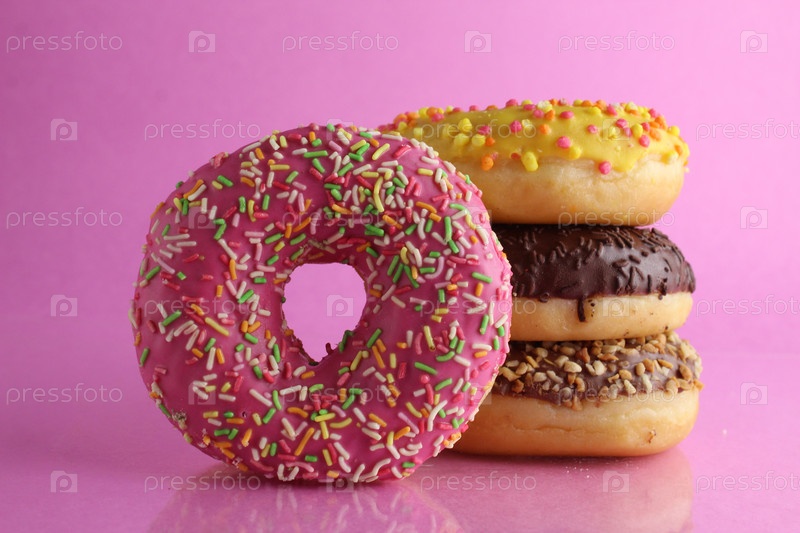 Сладкая натюрмортная пончик berliner крупный план позади лежит стек из трех пончиков розово-желтого шоколада на ярко-розовом фоне фуксии с пространством для текста и с кпикс для кафе для клея столовой ткань