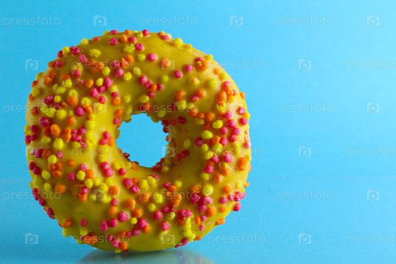 Берлинский пончик в желтом глазуре с цветной начинкой на ярко-синем фоне с пространством для текста копирование пространства тектонический плакат