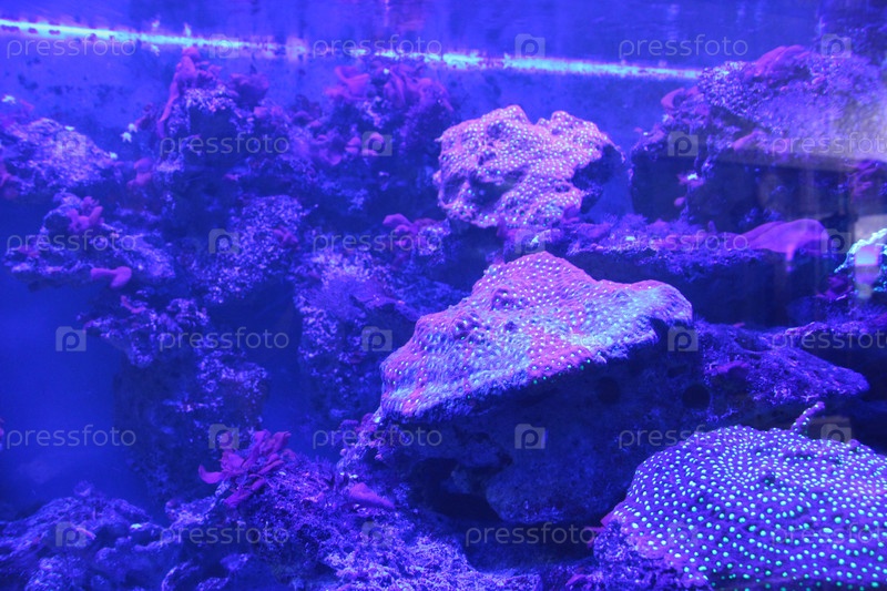 Кораллы рода Montipora в рифовом аквариуме в ближайшей синей воде