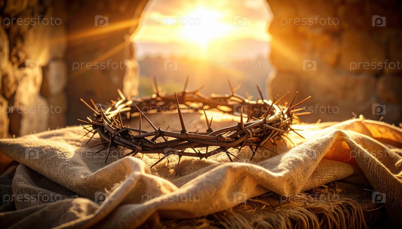Колючая корона, помещенная на ткань под солнечным светом, передает христианскую символику, жертву, пасхальную традицию, веру и универсальное послание страдания, искупления и надежды