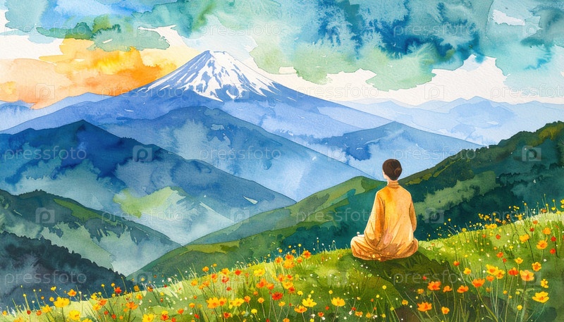Безмятежная акварельная живопись монаха, медитирующего на холме с цветками и горой Фудзи в отдалении, олицетворяющая осознанность, мир и духовную гармонию