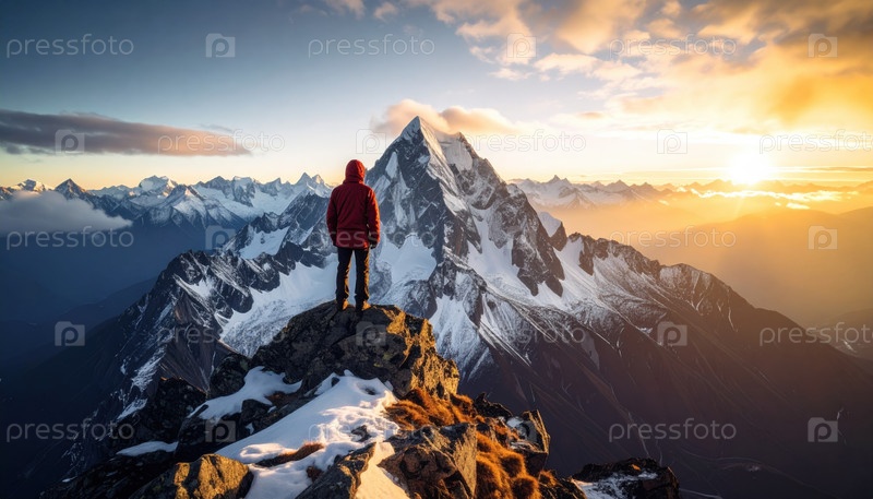 Приключитель в красной куртке стоит на снежном горном вершине на рассвете, символизируя человеческую смелость, исследование, устойчивость и триумф духа над крайностями природы
