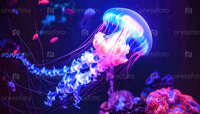 Светящаяся медуза, плавающая в неоновых водах, символизирующая тайну глубин моря, биолюминесценцию и красоту хрупких морских экосистем при футуристических условиях освещения