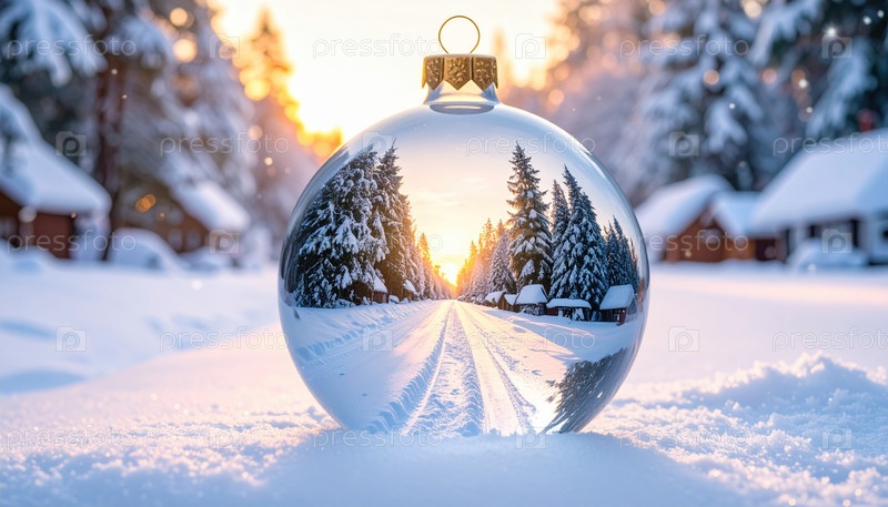 Снег покрывал зимнюю сельскую местность, отражаясь внутри стеклянного орнамента при закате солнца, символизируя дух празднования, ностальгию и магию сезонных торжеств и чудес