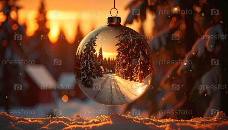 Рождественский орнамент, отражающий покрытую снегом лесную дорогу с закатным небом, символизируя праздничные зимние каникулы и теплые сезонные воспоминания