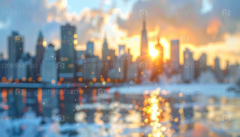 Художественный городской пейзаж с размытыми небоскребами, сияющим солнечным светом, отражениями на воде вызывают память, ностальгию и быстро меняющийся ритм современной жизни