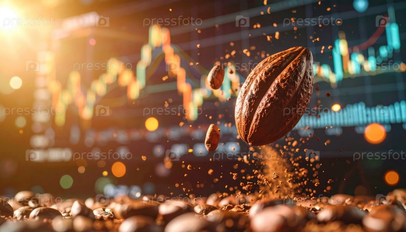 Летающие кофейные зерна с диаграммой фондового рынка, представляющей инвестиции в глобальную торговлю кофеином и динамическую энергию торговли