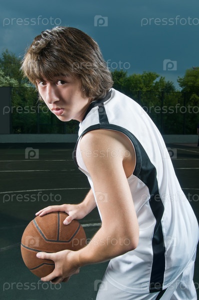 Подросток играет в баскетбол