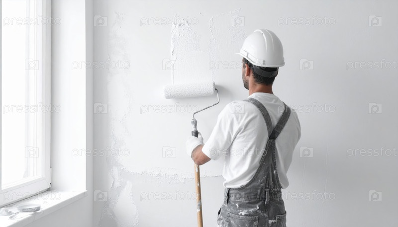 Строитель в комбинезоне рисует белую стену с роликом, символизирующим ремонт, труд, мастерство и постоянные усилия по строительству и улучшению пространств