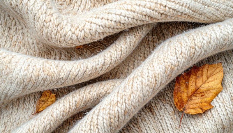 Теплая вязаная шерстяная ткань с осенними листьями символизирует уютный сезон, комфорт, осеннюю моду и тенденции медленного образа жизни в естественном настроении