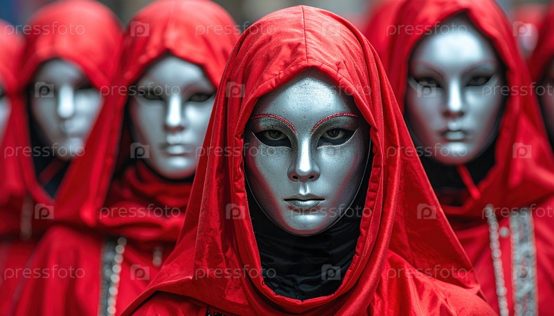 Маскированные фигуры в красных плащах представляют карнавальную идентичность, загадочные культурные представления и символические традиции, часто ассоциируемые с художественными собраниями и праздничными мероприятиями