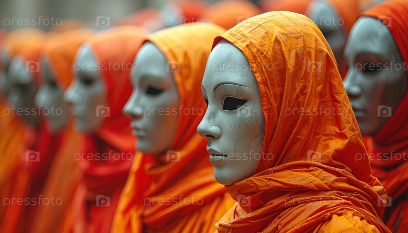 Ряды замаскированных фигур в оранжевых халатах создают сюрреалистическое шествие, символизирующее соответствие, ритуал, скрытую идентичность и социальный комментарий через визуальное искусство
