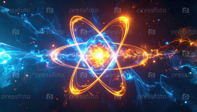 Яркая атомная структура с огненным ядром и энергетическими орбитами, символизирующие науку, ядерную энергию, энергетические дебаты, инновации и непреодолимую силу открытий