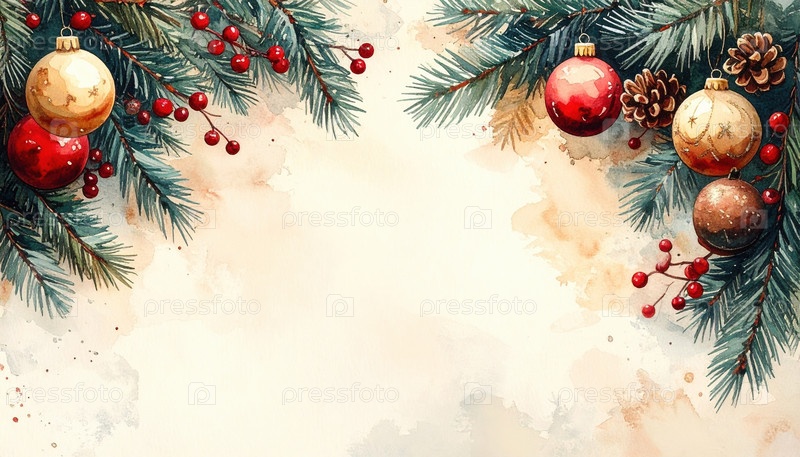 Акварельная граница сосновых ветвей, красных ягод и пузырей, образующих праздничную рождественскую раму, идеально подходит для зимних открыток и сезонных поздравлений