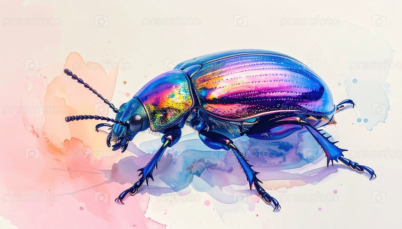 Яркий акварельный крупный план радужного жука с радужными металлическими оттенками, символизирующими разнообразие, трансформацию и чудо естественного микрокосмоса